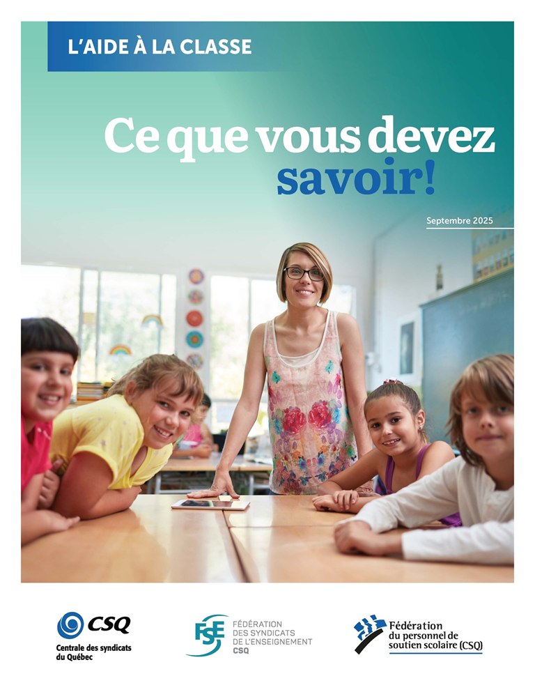 Vous remarquerez à la lecture des documents l’utilisation du terme « aide à la classe » dans le Guide CSQ et dans la Convention collective du personnel enseignant alors que le terme « soutien en classe » est utilisé dans la Convention collective du personnel de soutien scolaire.